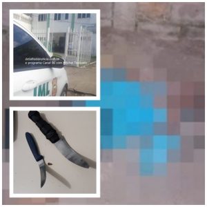 A Guarnição de imediato se deslocou ao endereço citado, la chegando, foi constatado que a vítima estava no chão com uma perfuração no abdômen, sem sinais vitais, momentos depois uma Guarnição do Samu constatou o óbito.