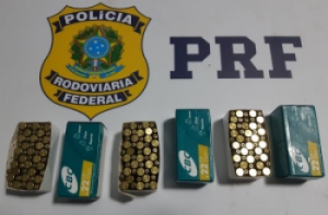 Um foragido da Justiça procurado por crime de receptação m foi preso pela Polícia Rodoviária Federal com várias munições e porte ilegal de arma de fogo.