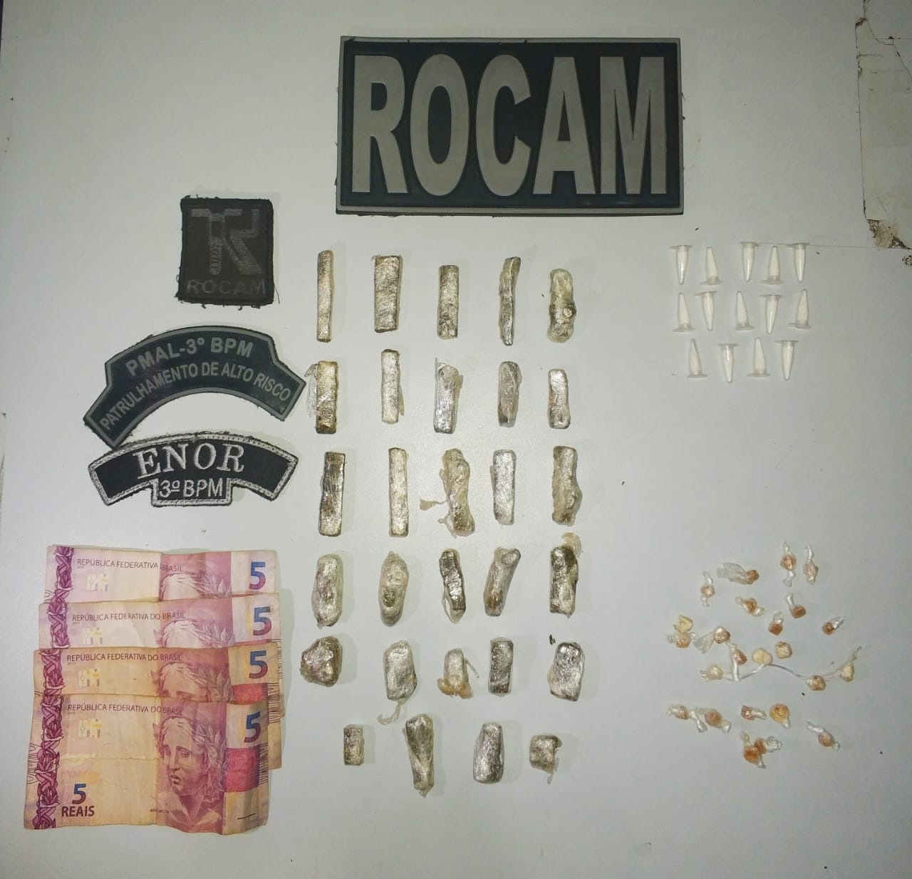 Ao ser feita a varredura no local, foi encontrado 4 pedras de uma substância análoga a crack e ao ser indagada, a acusada afirmou ter jogado ao visualizar a Guarnição. Ao realizar mais buscas nos entulhos, foi encontrado enterrado mais substâncias análogas a maconha, crack e cocaína, além de uma certa quantia em dinheiro.