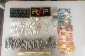Dentro da bolsa, os militares encontraram 70 barões de maconha, 63 pinos de cocaína, 40 pedras de crack e uma balança de precisão, além de R$ 302,00 em espécie e papel filme. Diante da constatação, o indivíduo foi então encaminhado à Central de Polícia, no bairro Baixão, e autuado pelo crime de Tráfico de drogas.